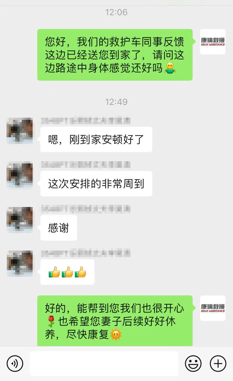 客户对康瑞救援如此快速的响应,周到的安排以及温馨的服务表示十分赞赏和感谢。
